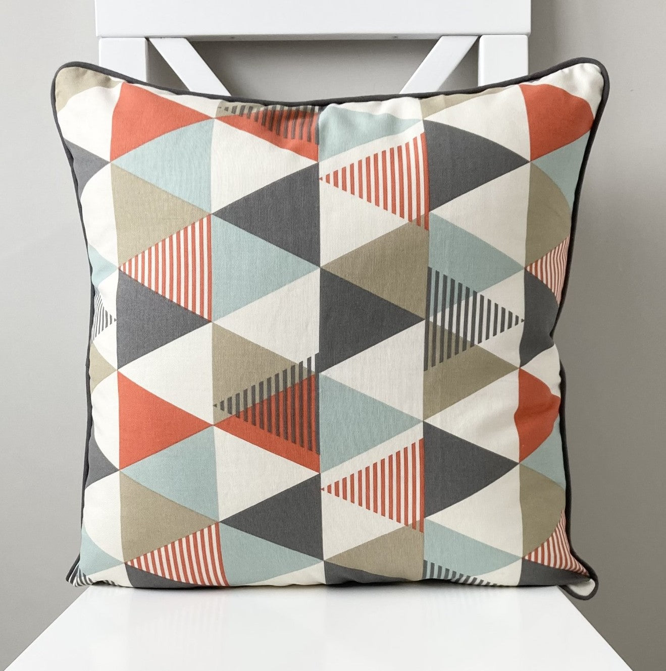 Colourful geometric print cushion to add a burst of colour to any decor. Made from high quality, thick cotton in 3 lovely colourways with contrast piping, these striking cushions contrast beautifully with plain cushions.