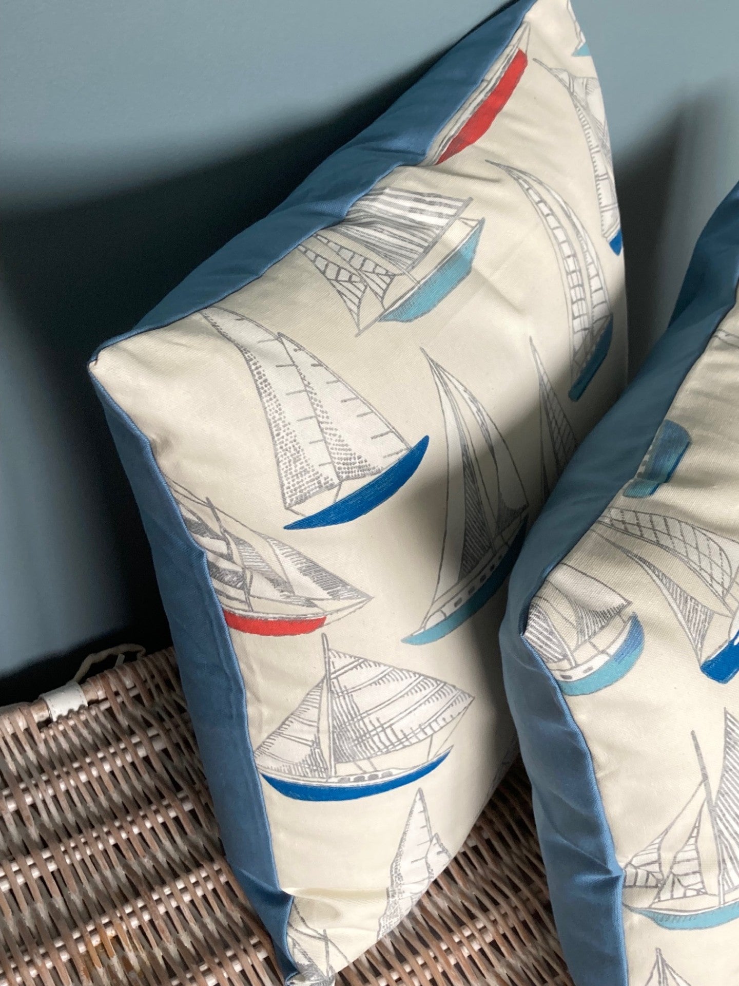 Nautical themed cushion with an elegant yacht print on a cream background. 100% cotton print with a plain blue cotton canvas back. Great for nautical, coastal or seaside themed decor, this cushion comes in 2 shapes - square or rectangular.